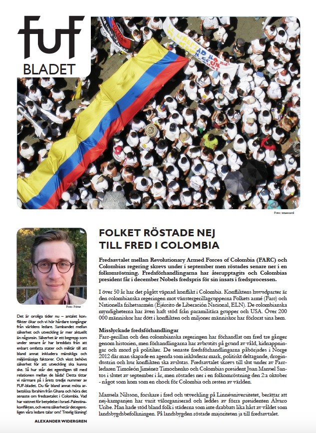 FUF-bladet No 3 2016 I detta tredje FUF-bladsnummer för året tittar vi närmare på sambandet mellan utveckling och säkerhet. Ni får bland annat läsa om två olika fredsavtal i Colombia och Afghanistan; om vattenkrisen i Jordandalen; om hur jämställdhet leder till fred; och om Stockholms- deklarationen som ska förebygga konflikter. Trevlig läsning!