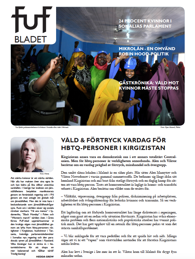 FUF-bladet No 1 2017 I detta första FUF-bladsnummer för året tittar vi närmare på jämställdheten. Ni får bland annat läsa om den latinamerikanska rörelsen Ni una menos som organiserar sig för att stoppa våld mot kvinnor; om kvinnor i norra Tanzania som gifter sig med varandra för att behålla sin mark och försörjning; och om …