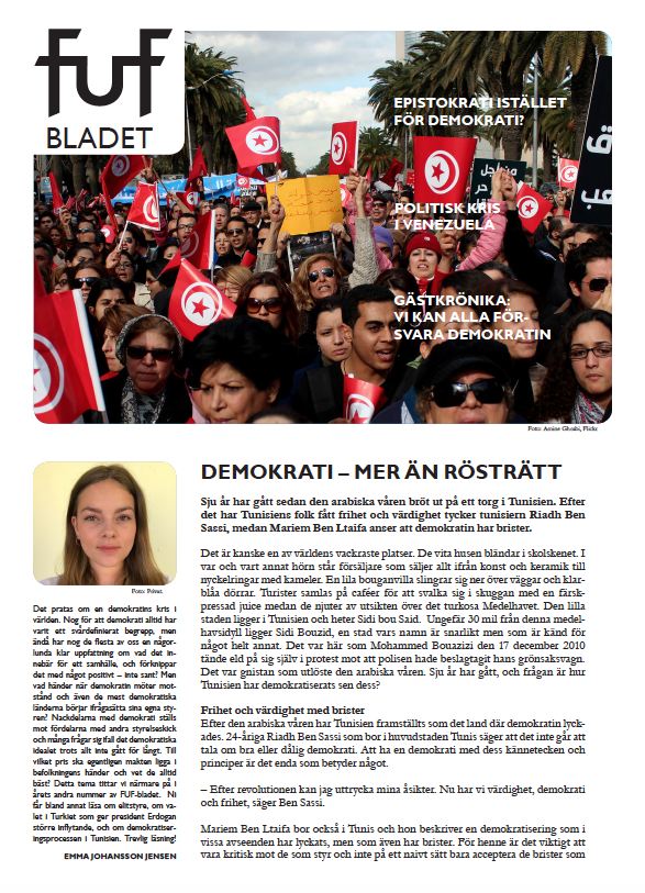 FUF-bladet No 2 2017 Det pratas om en demokrati i kris. Detta tema tittar vi närmare på i årets andra nummer av FUF-bladet. Ni får bland annat betraktelser från en minnesstund i Sydafrika, en rapport om den politiska krisen i Venezuela och två tunisiers tankar om demokratin efter den arabiska våren. Trevlig läsning!